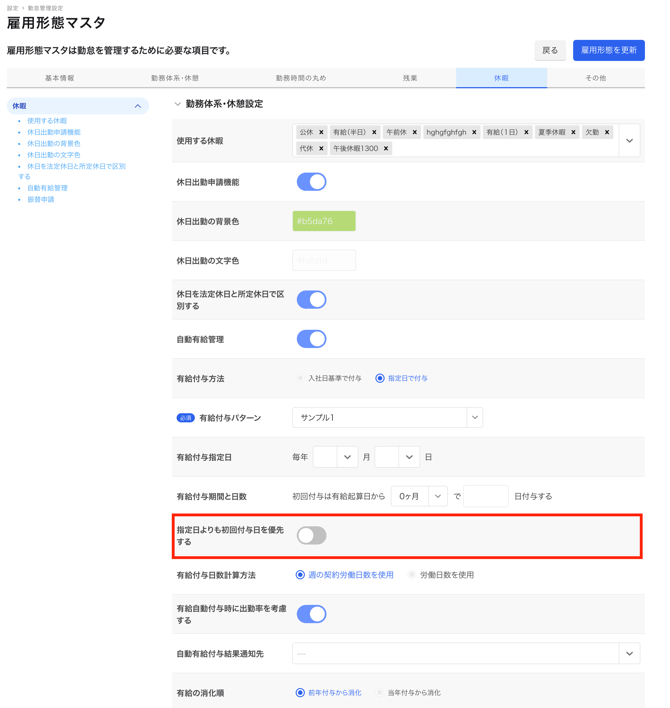 有給自動付与にて、指定日で付与を利用している場合、初回付与日より指定日が先に来てしまうと、指定日の付与処理が行われるようになっていましたが、雇用形態マスタに「指定日よりも初回付与日を優先する」の設定項目追加し、どちらを優先するかできるように改善いたしました。