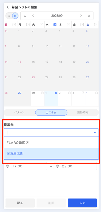 2.マイシフトの提出先を所属店舗以外も申請できるように変更