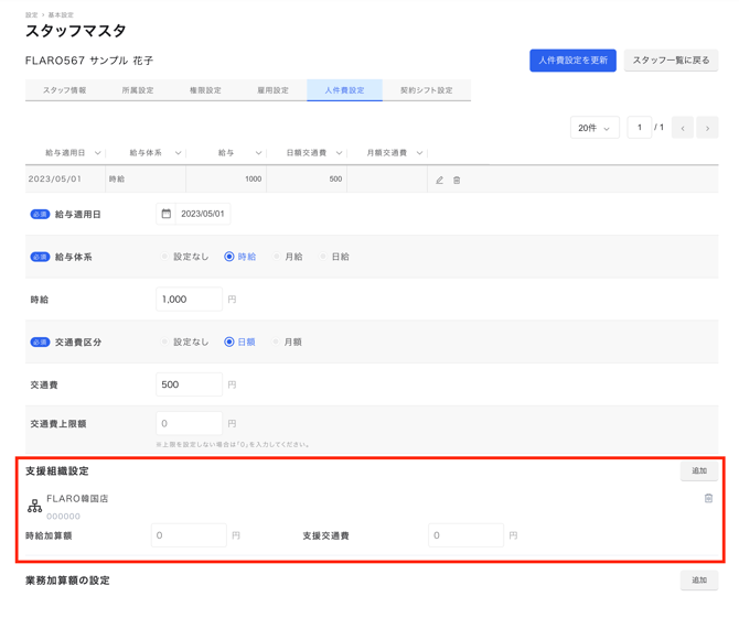 ※マイシフトで所属店舗以外にも提出させるためには、スタッフマスタ画面>人件費設定の支援組織設定に店舗を追加する必要があります。