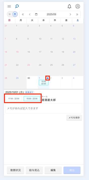 希望したシフトと確定シフトが異なるときは、カレンダーにはアラートアイコン、詳細画面には「差異あり」と表示されるようになっております。