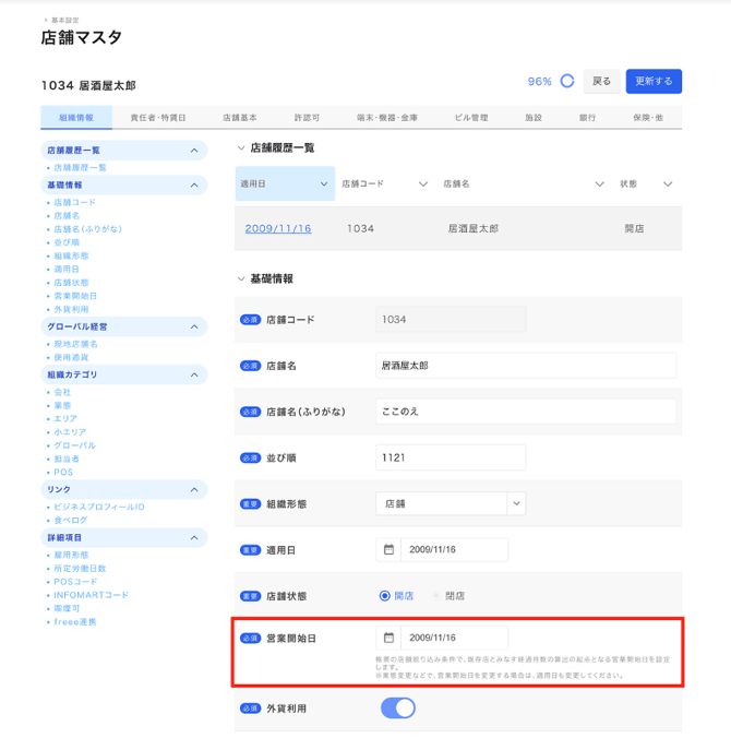 基本設定 店舗マスタ 組織情報 基礎情報 営業開始日