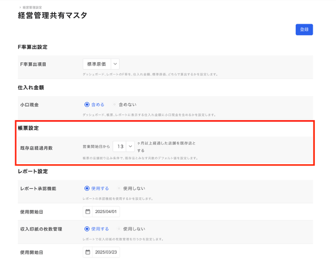 経営管理設定 経営管理共有マスタ 帳票設定 既存店経過月数
