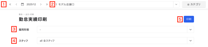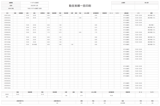 勤怠実績印刷では営業月・店舗単位で勤怠データを集計したPDFファイルを作成することができます。