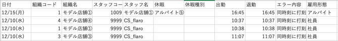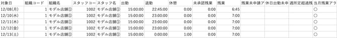 組織や雇用形態、スタッフを指定して日別勤怠、未承認申請一覧、エラー実績一覧、アラート実績一覧を出力してCSVファイルとしてダウンロードすることができます。