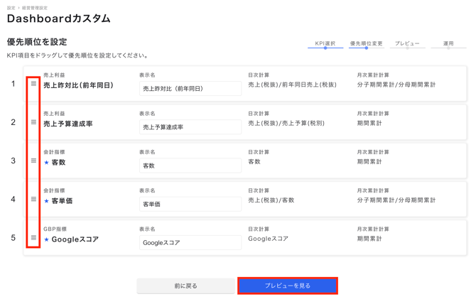 2.KPIを選択から、表示したい項目を5つ選択し、次へ進むを押す