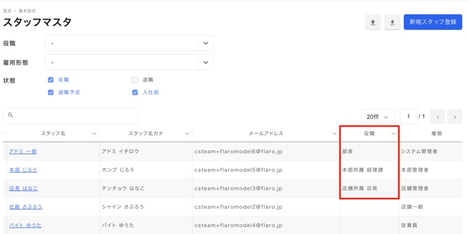 「スタッフマスタ」でスタッフ一覧を確認する際、各スタッフの役職を一覧上で確認できます。一目で、どのスタッフがどの役職に所属しているか把握することが可能です。