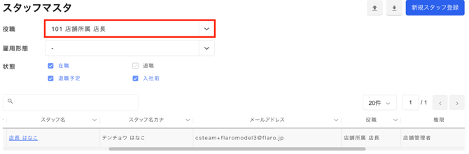「スタッフマスタ」で役職ごとに絞り込みを行うことが可能です。