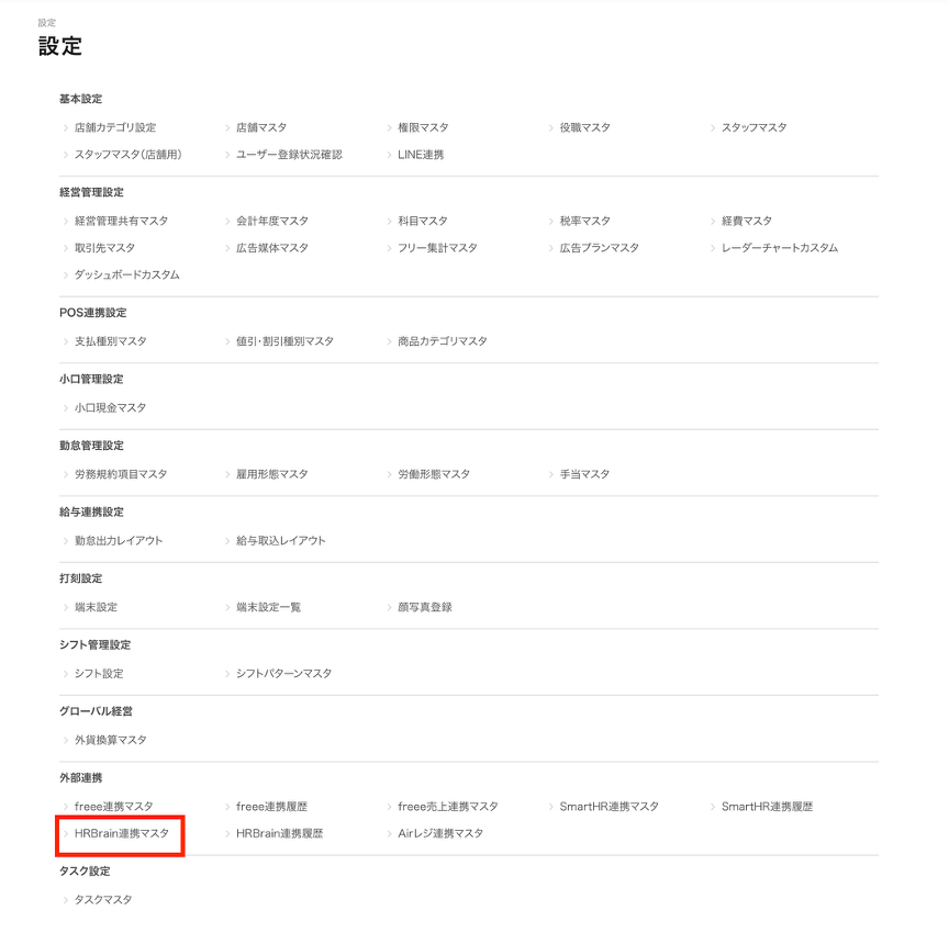 画面上部のメニューから「設定」をクリックし、「HRBrain連携マスタ」を選択します。