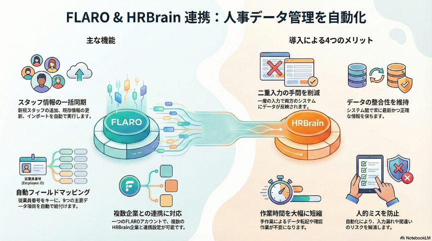 HRBrain連携機能は、FLAROに登録されているスタッフ情報をHRBrainに同期する機能です。この機能を利用することで、人事データの二重入力を削減し、データの整合性を維持することができます。