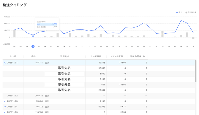 「計上日」に仕入を行った取引先名の一覧が表示されます。 - フード原価