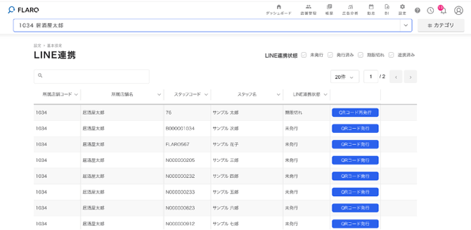FLARO管理画面にログインし、サイドバーから「LINE連携」を選択すると、店舗に所属するスタッフのLINE連携状況を一覧で確認できます。