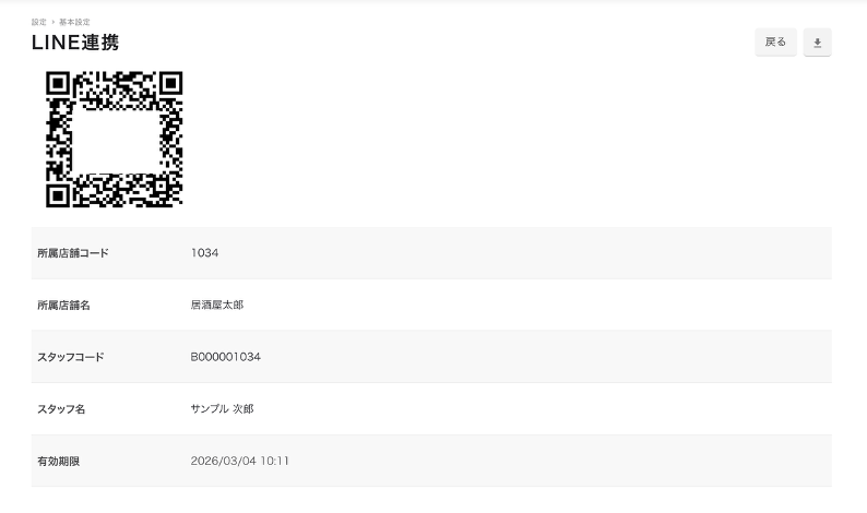 QRコードの有効期限が切れた場合は再発行が必要です。LINE連携管理画面で対象スタッフの詳細画面を開き、再発行ボタンをクリックしてください。
