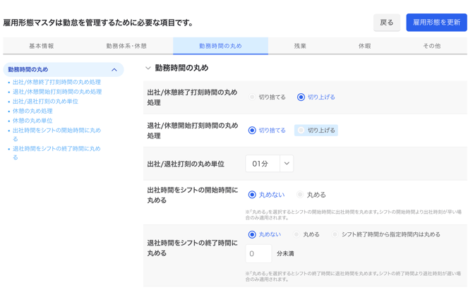 勤怠管理設定>雇用形態作成 の勤務時間の丸め設定項目を確認します。