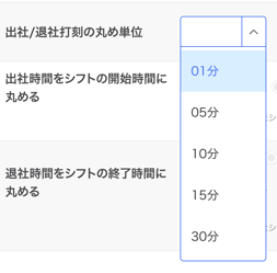 シフトの終了時間より退社時刻が遅い場合のみ適用されます。 - シフト終了時間から指定時間内は丸める