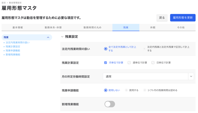 A.1.雇用形態マスタ>残業設定を行い