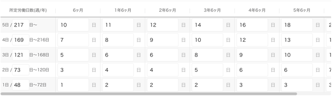 契約労働日数に応じて、「労務規約項目マスタ」の「有休パターン」に設定された日数分の有休が付与されます。 - 労働形態
