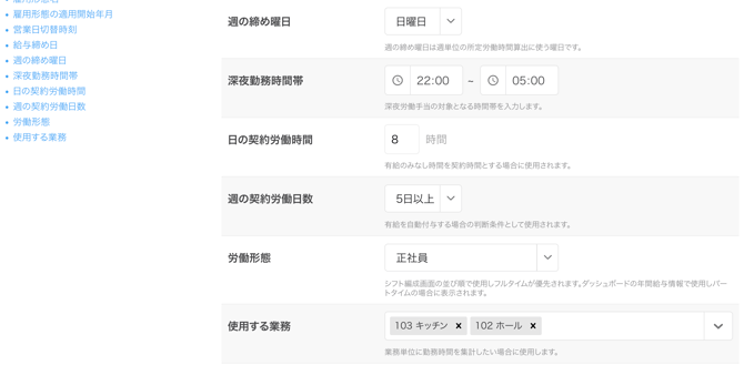 「スタッフマスタ」で新規スタッフを登録する場合、または既存スタッフを編集する場合において、スタッフの入社日が雇用形態の適用開始年月以降である場合にのみ、その雇用形態をスタッフに登録することが可能となります。 - 営業日切替時刻