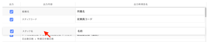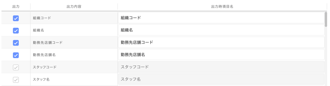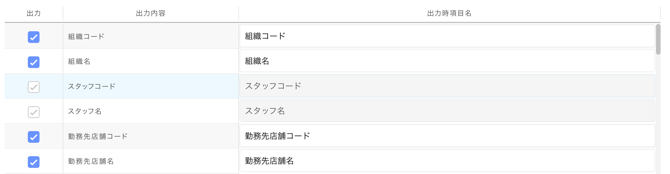 「勤怠確定」で出力する CSV の項目として使用するかどうかを選択できます。