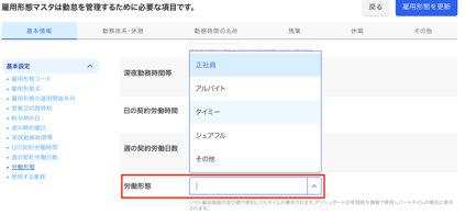 また、「雇用形態マスタ」にて雇用形態へ労働形態を紐づけることで、対象者が打刻した際に、その労働形態に応じた人件費が計上されるようになります。