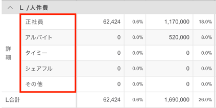 登録した番号が小さい順から、「レポート」の人件費内訳の項目が表示されます。
