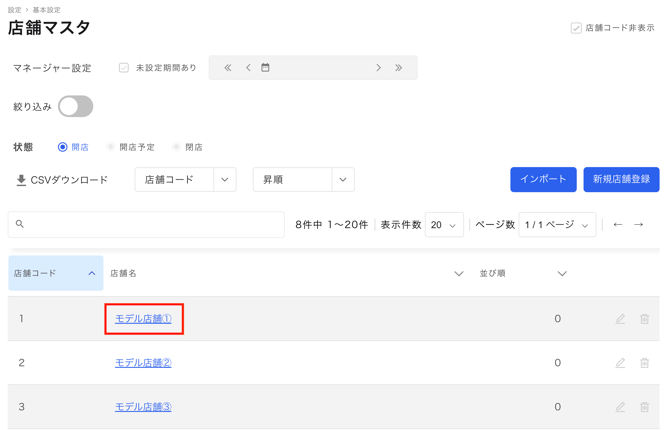 適用日が現在の日付以前で登録された場合、ステータスは「開店」となります。 - 開店予定