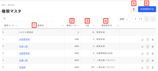 権限マスタでは、スタッフに付与する権限を設定することができます。