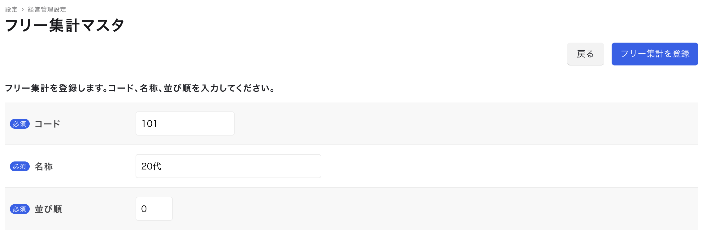 会社全体で使用するフリー集計に紐づくコードを設定します。 - 名称