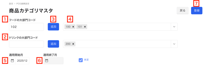 フード仕入として振り分けを行うための部門コードを入力します。 - ドリンクのコード入力欄