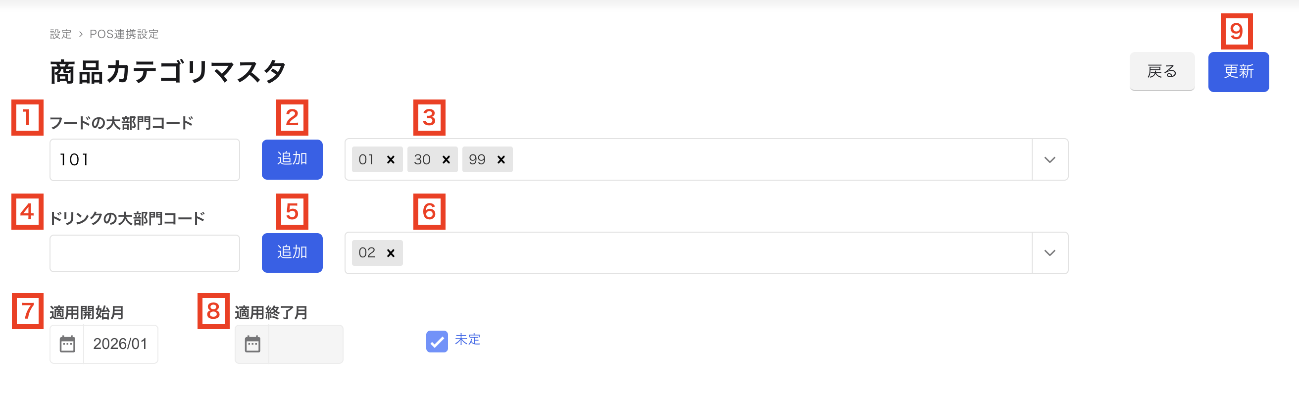 適用されている部門コードの一覧が表示されます。 - ドリンクの大部門コード入力欄