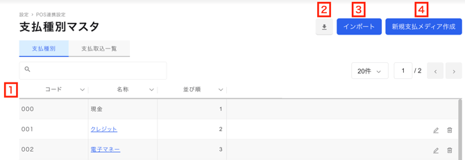 「支払種別」で登録した項目を、「支払種別取込一覧」にて店舗ごとに紐づけることで、各店舗に適用する支払種別項目を設定します。 - 並び順