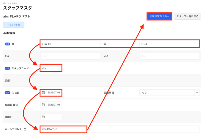 1-2 必須項目である姓名、スタッフコード、入社日を入力する