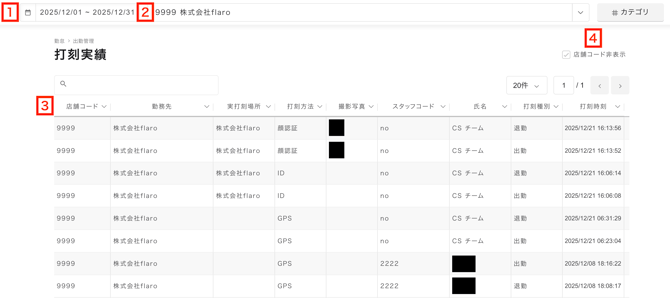 打刻を行った店舗の店舗コードが表示されます。 - 勤務先